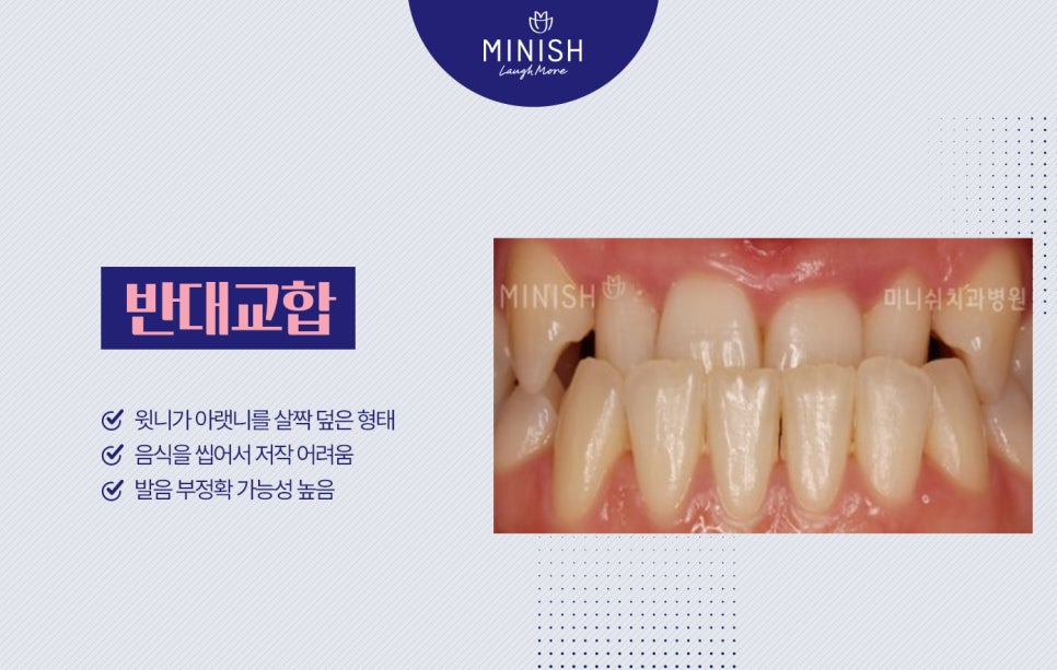 대부분 사람들의 치아 맞물림 형태는 윗니가 아랫니를 살짝 덮은 형태를 보입니다. 하지만 반대교합은 아랫니가 윗니를 덮은 형태로 반대로 맞물린다 하여 반대교합이라고 명하고 있습니다. 치아가 반대로 물려 있기 때문에 발음은 물론 음식을 씹어서 저작하는 것까지 어려움이 많아 교정이 필요합니다.