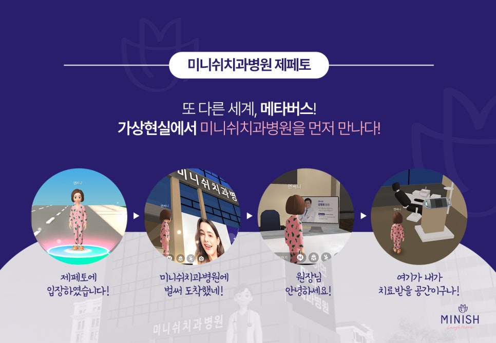 이러한 가상현실 메타버스에서 저희 미니쉬치과병원을 만나실 수 있습니다. 바로 제페토라는 어플리케이션을 이용하시면 되는데요! 가상 현실에서 치과를 먼저 내원해 봄으로써 치료에 대한 정보를 얻고 치과에 대한 결정이나 치료에 도움을 받았으면 하는 마음에서입니다. 조금 더 친숙한 이미지로 치과나 치료에 대한 공포감도 덜어드리고 싶었구요!