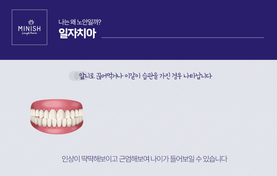 일자 치아를 가진 사람의 경우 입꼬리는 웃고 있지만 치아라인이 직선으로 각져 보여 사람의 인상을 딱딱해 보이게 만들며, 그로 인해 근엄한 이미지를 심어주어 노안 얼굴로 보이기도 합니다.