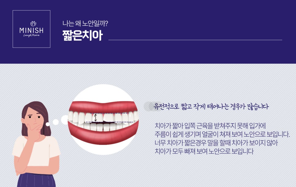 짧은 치아를 가지신 분들의 경우 유전적인 이유로 태어날 때부터 치아가 짧고 작게 태어나신 분들이 많아요. 유전적인 이유 외에도 마모로 인해 치아가 짧아지기도 합니다. 치아가 짧기 때문에 말을 하거나 웃을 때 이가 안보이는 경우가 많고 전체 얼굴 길이가 짧아져 팔자주름이 심해지게 됩니다.