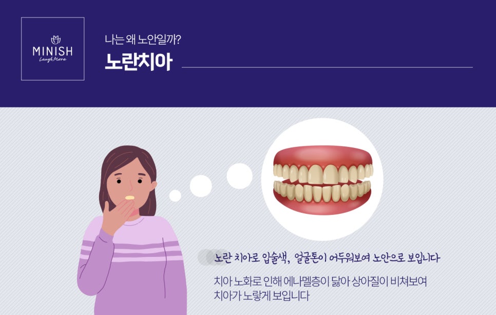 누런치아는 나이가 들면서 치아가 착색되었다기보다는 시간이 서서히 지나면서 치아의 가장 바깥층인 에나멜층이 사라지면서 안쪽의 상아질이 비쳐 겉으로 보았을 때 치아가 누렇게 보이게 되는 것입니다.