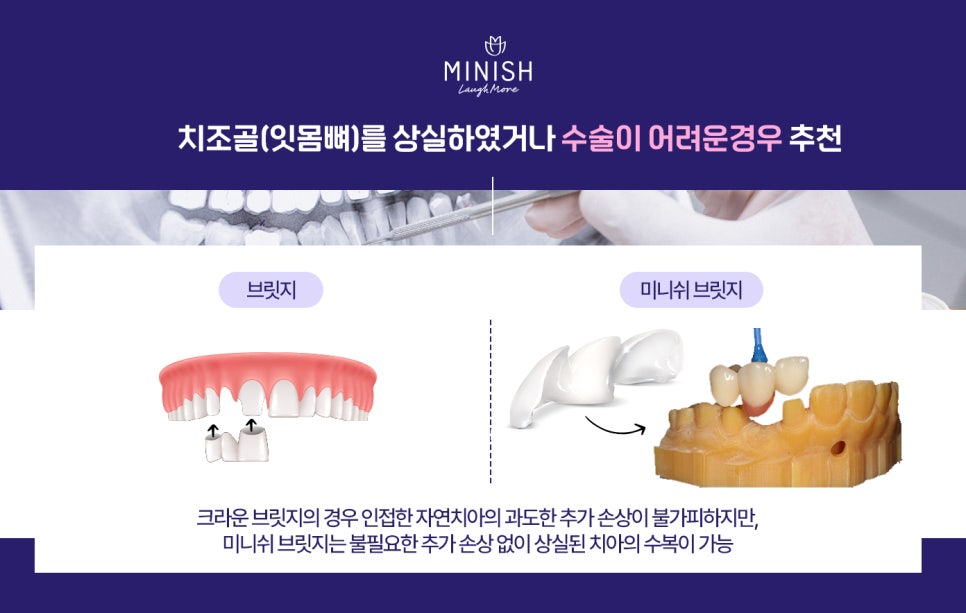미니쉬치과병원에서도 기존 멀쩡한 치아를 삭제한 뒤 고리를 연결하는 크라운 브릿지가 아닌, 불필요한 치아 손상을 없애면서 치아의 저작력과 건강, 심미를 회복하는 방법을 제안드리고 있습니다. 무엇보다 치아상실 전 예방으로 소중한 치아를 지키는 것이 가장 중요하겠죠!