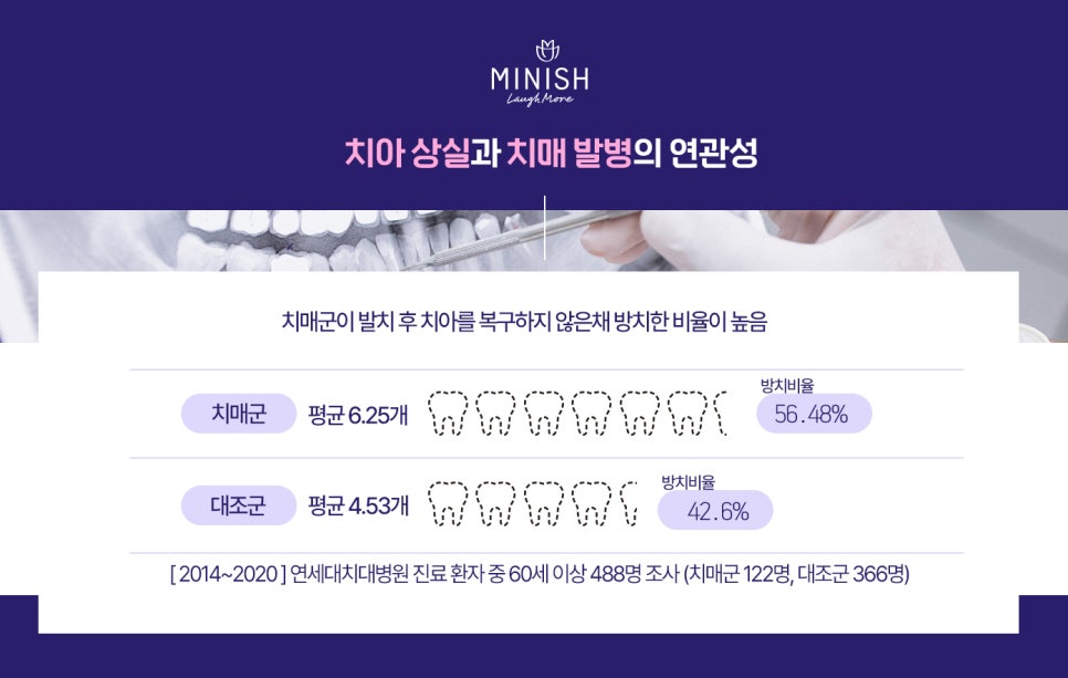 2014~2020년 연세대 치대병원에서 진료를 받은 60세 이상 488명(치매 군 122명, 대조군 366명)을 대상으로 그 상관성을 조사했습니다.