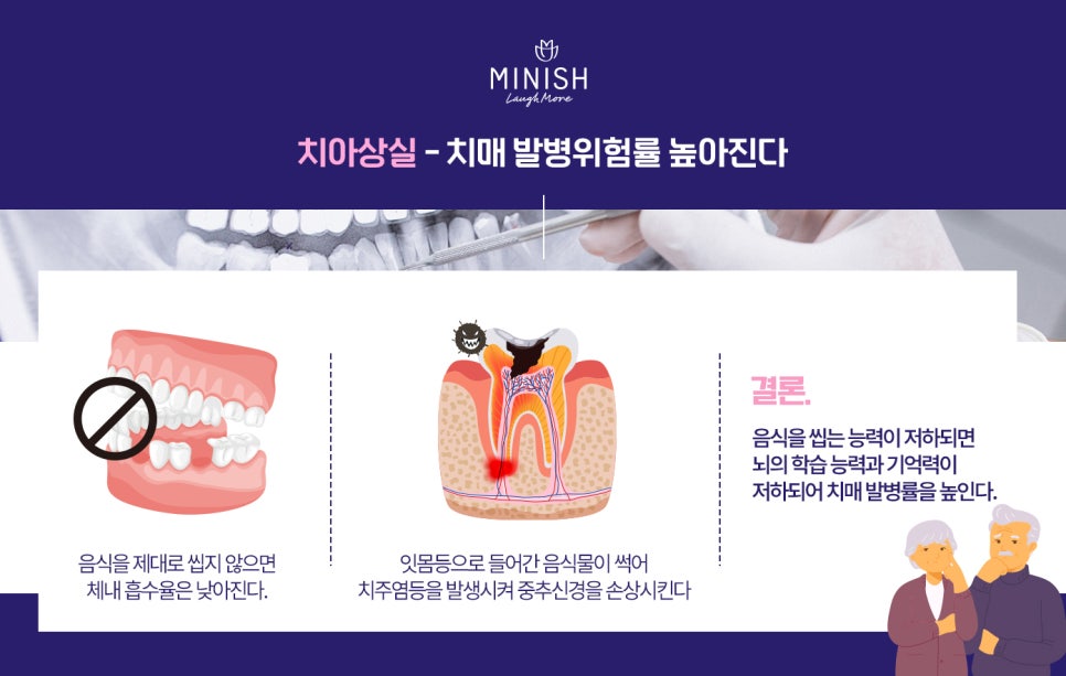 치아가 상실되면 심미적으로도 좋지 않지만, 인간에게 중요한 저작능력이 떨어지면서 치매나 소화불량 등 크고 작은 부작용을 불러올 수 있습니다.