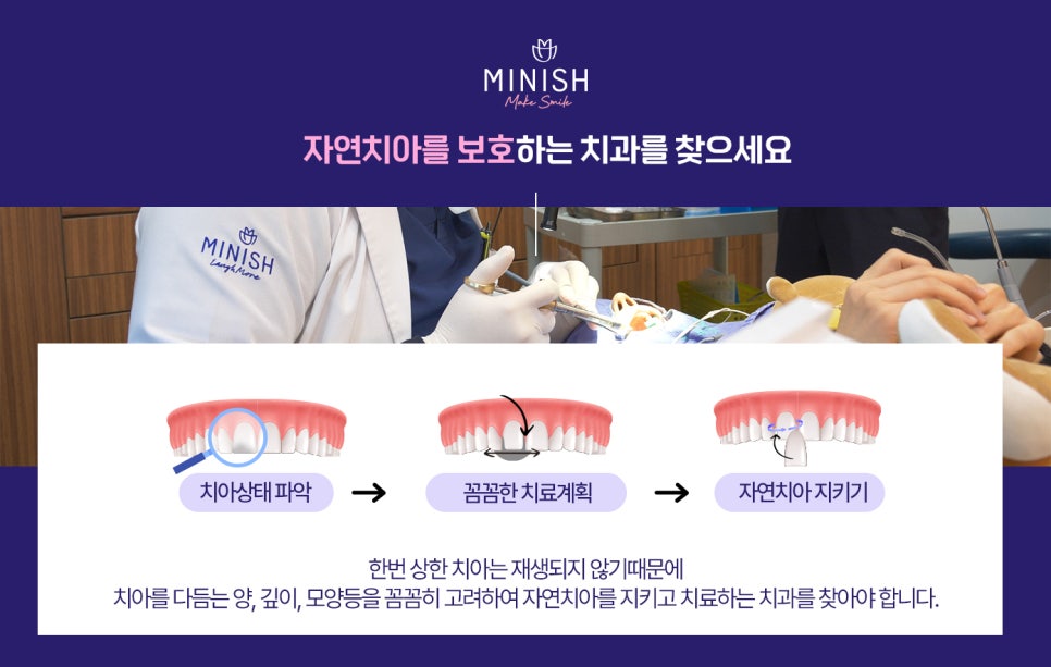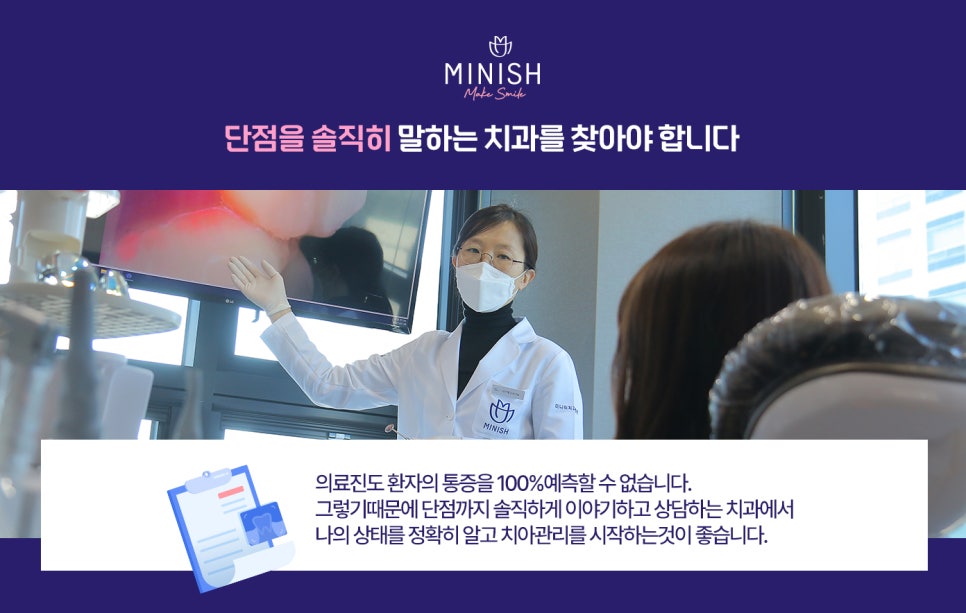 그동안 친구 추천, 지인 추천 등으로만 치과를 찾으셨던 분들이라면 위 내용을 참고하셔서 좋은 치과, 나에게 필요한 치과를 선택하시길 바랍니다! 미니쉬치과병원은 '과잉없는 치료', '해가 없는 치료', '통증 없는 치료'라는 신념을 가지고 환자분의 치아 건강 회복을 위해 노력합니다. 치아 건강 문제나 고민이 있으시다면 언제든 편안히 내원하셔서 상담 받아보시길 권유드립니다.