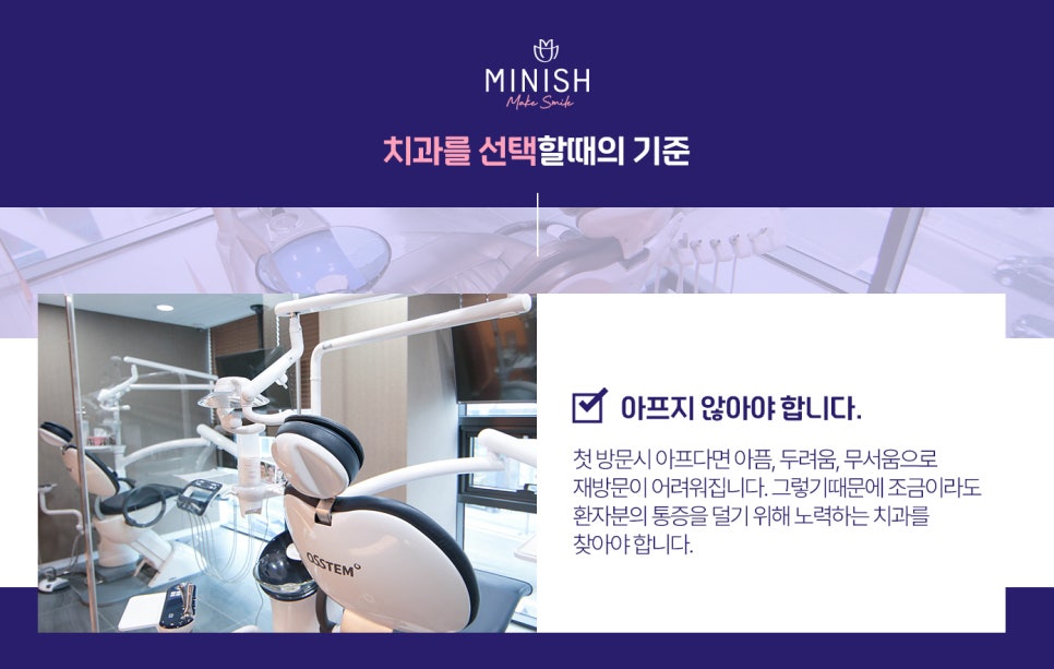 가장 우선적으로 환자를 생각하는 마음이기도 한데요. 아프지 않게 치료하겠다는 의료진의 마음과 아프지 않았으면 좋겠다는 환자를 생각하는 마음이 합쳐져 환자가 통증을 최소화하고 편안하게 치료받을 수 있는 것! 그것을 첫 번째로 생각하는 치과를 선택하시는 것이 좋습니다.