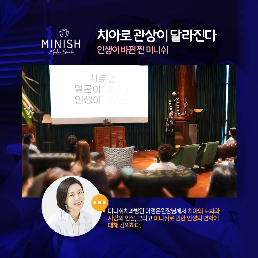 이정은원장님은 미니쉬 경력이 많으신 분으로, 미니쉬 사례자들의 사진과 함께 미니쉬로 어떻게 얼굴이 바뀌며 인상이 바뀌면 인생까지 달라질 수 있다는 점을 자세히 알려주는 자리가 되었습니다.