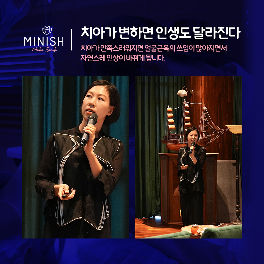 강연에서 실제 다양한 사례를 소개해 주셨는데요. 시술을 많이 하셔서 근육이 잘 움직이지 않는데 치아가 너무 작아 근육을 서포트 할 수 없어 입꼬리를 올리는 입술의 힘이 약해지는 사례에서는 치아를 조금 정리해주면 안썼던 근육들이 서포트 되면서 표정과 인상이 밝아진다고 합니다. 위염,식도염 등으로 위산에 치아가 노출되어있는 분은 미니쉬를 받은 이후로 식사가 달라져서 건강이 좋아진다고 합니다. 부정교합으로 식사가 어려운 치아 역시 미니쉬 후 인상이 바뀜에 따라 눈 밑 어두운 느낌이 달라지고 식사가 편해졌다고 합니다.