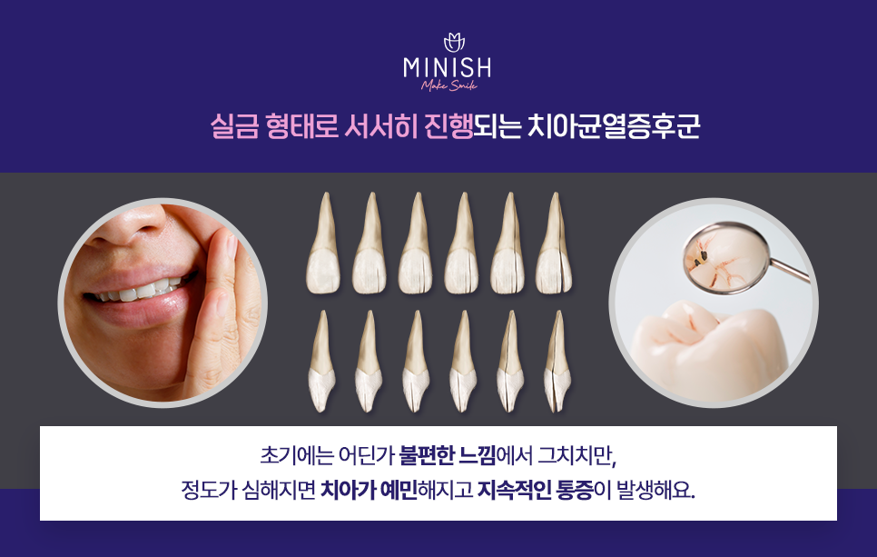 치아균열증후군 초기에는 어딘가 불편한 느낌에서 그치지만, 정도가 심해지면 치아가 예민해지고 지속적인 통증이 발생해요.
