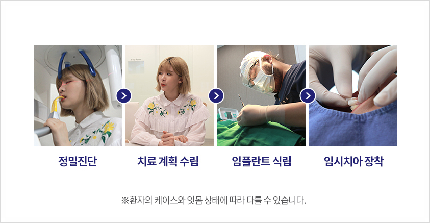 '①정밀진단 - ②치료계획수립 - ③임플란트 실립 - ④임시치아 장착'으로 나뉩니다.