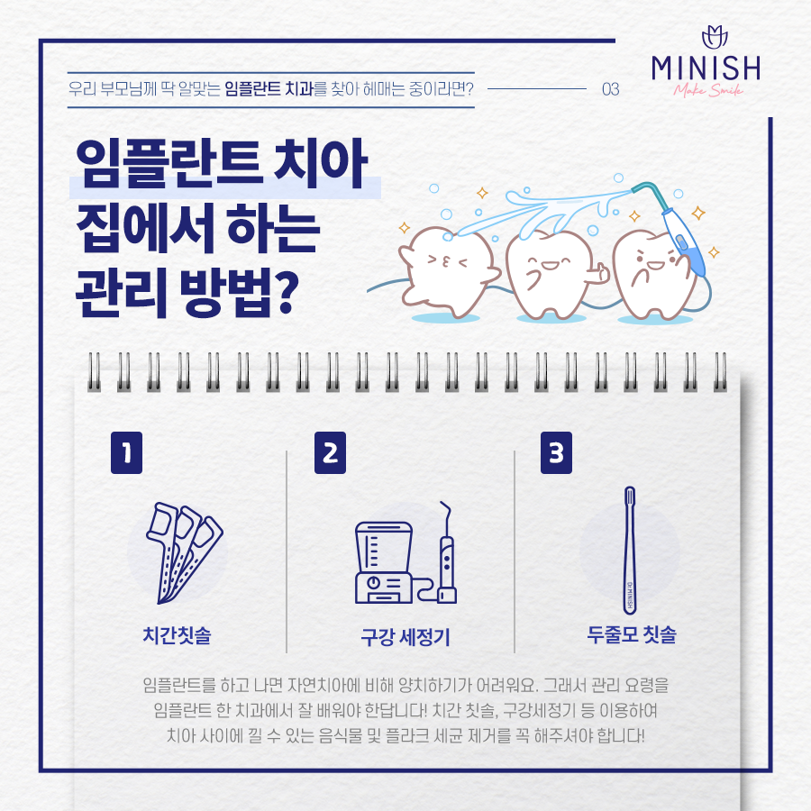 그래서 임플란트는 시술 후 관리가 정말 중요합니다! 물론 관리 방법도 바로 알려드릴게요~