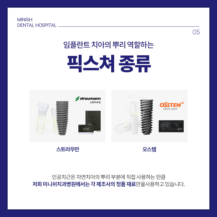 공통적으로 임플란트 치아의 뿌리 역할을 하는 '픽스처'는 반드시 각 제조사의 정품을 사용해야 합니다.