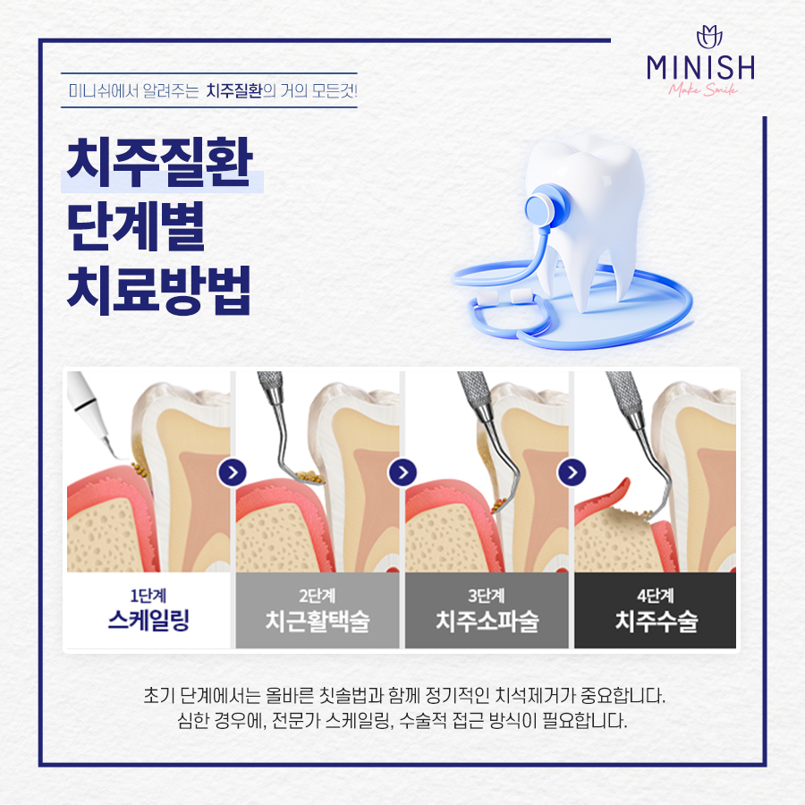 치주질환 1단계부터 전문가 도움을 받아 스케일링을 진행하시고, 필요한 치료도 적절하게 병행하셔야 합니다.