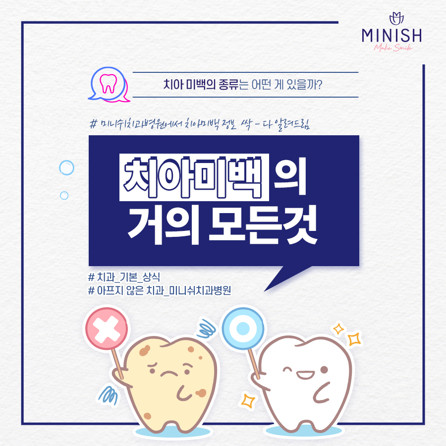 안녕하세요. 미니쉬치과병원입니다. 오늘은 '거의 모든 것' 마지막 주제인 '치아미백의 거의 모든 것' 정보를 준비했습니다. 추석 연휴 중에 정주행하시면 좋은 치아 건강 정보, 소중한 가족분과 함께 공유해보세요! 임플란트치료의 거의 모든 것 크라운치료의 거의 모든 것 치과 스케일링의 거의 모든 것 치주질환의...