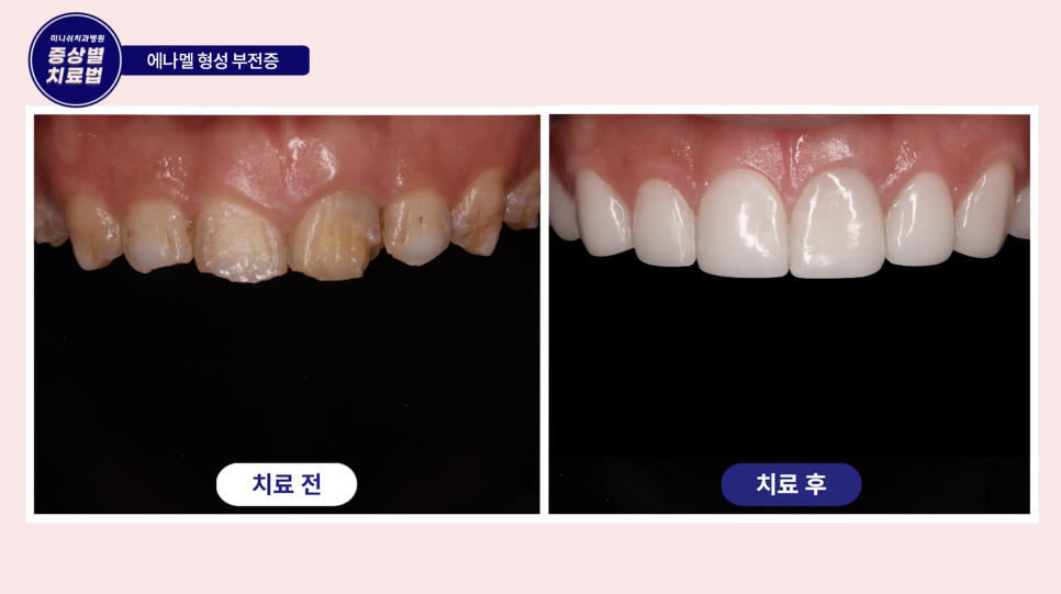 아래, 에나멜 형성 부전증으로 색상은 물론 치아 형태까지 손상된 아래 케이스를 한번 보실까요?