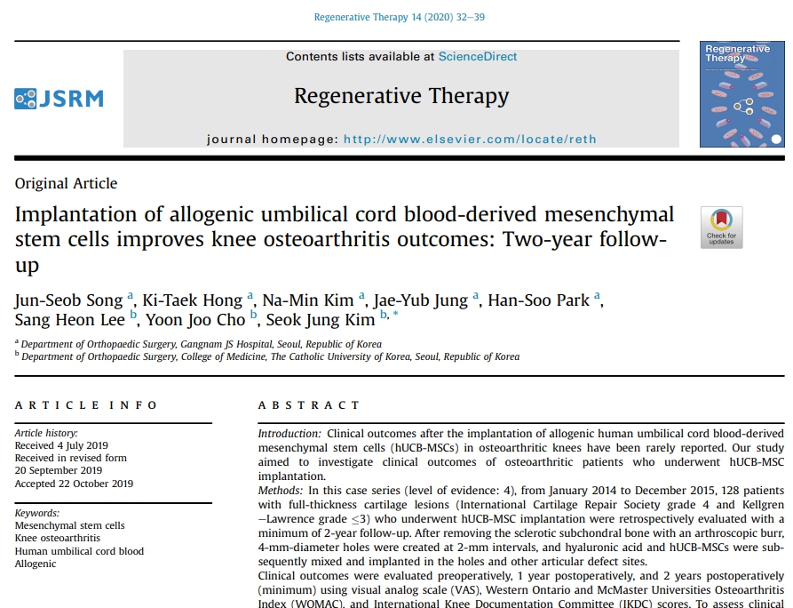 Regenerative Therapy에 실린 논문. 이미지를 클릭하면 다운로드받을 수 있습니다. (Implantation of allogenic umbilical cord blood-derived mesenchymal stem cells improves knee osteoarthritis outcomes: Two-year followup(동종 제대혈 유래 중간엽 줄기세포 이식으로 무릎 골관절염 결과 개선 : 2년 추적 관찰).