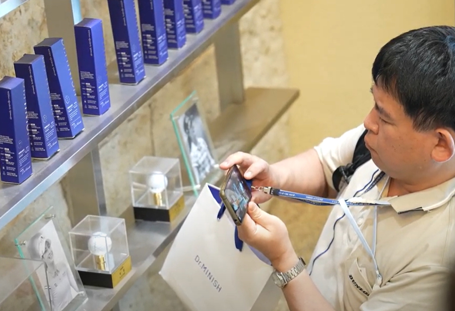 닥터미니쉬 칫솔과 미니쉬한 골프 선수들의 사인볼을 촬영하는 참가자의 모습이 눈에 띕니다.