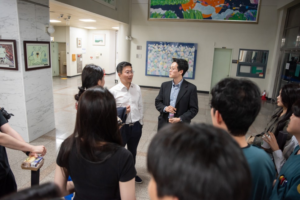 강연 후 로비에서 학생들과 대화를 나누고 있는 모습.