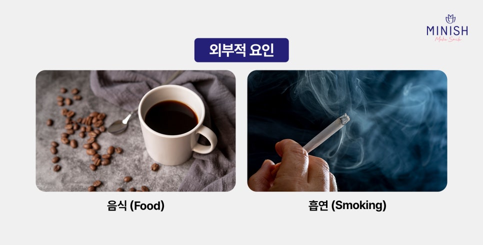 - 식습관 : 커피, 차, 레드 와인, 카레 같은 색소가 많은 음식과 음료는 치아를 얼룩지게 할 수 있습니다.
