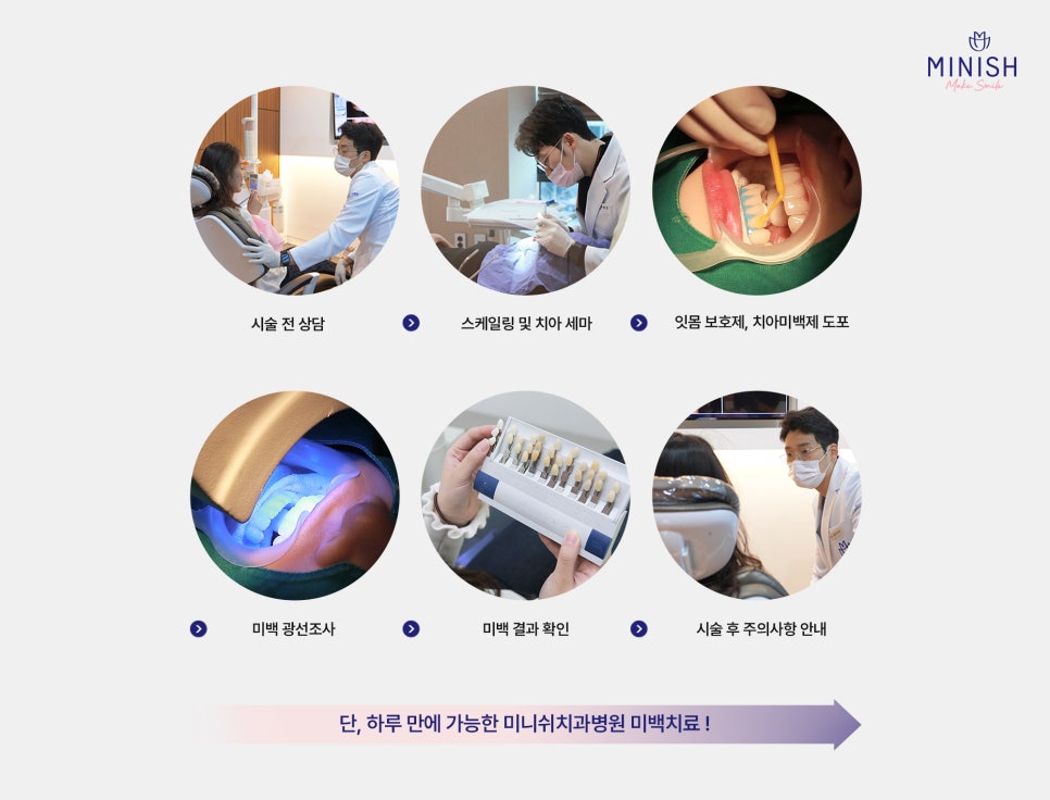 미니쉬 치료는 단순한 미백을 넘어 치아 건강을 위한 포괄적인 치료 방법입니다. 이 치료는 치아뿐만 아니라 잇몸 건강까지 함께 챙길 수 있어 더욱 효과적입니다. 미니쉬는 단순 색상의 개선만이 아닌 질감과 투명도의 개선까지도 가능합니다.
