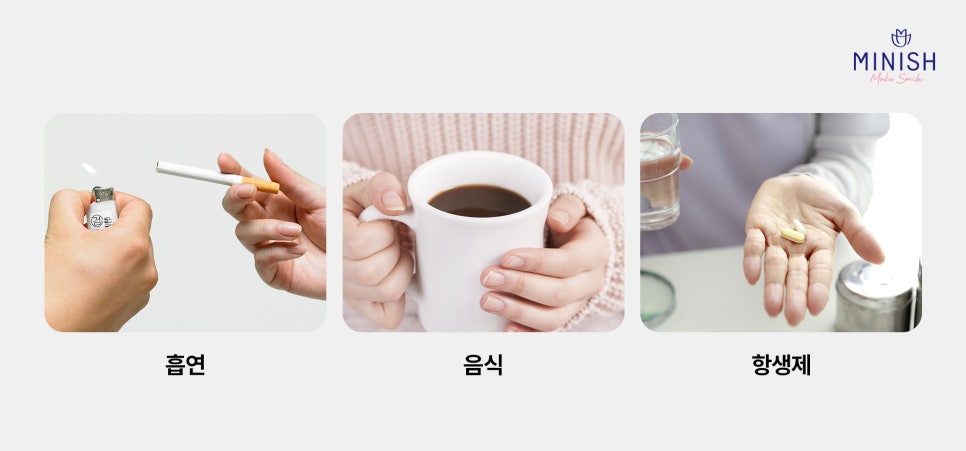 후천적 요인: 후천적으로는 우리가 섭취하는 커피, 홍차, 초콜릿 등의 음식이 치아를 착색시킬 수 있으며, 흡연은 니코틴과 타르 성분이 치아를 누렇게 변색시킵니다. 또한, 나이가 들면서 법랑질이 마모되면 상아질이 비쳐 치아가 점점 노래질 수 있습니다. 이 외에도 약물 사용, 외부 충격, 신경 치료 후의 부작용으로 인해 치아변색이 일어날 수 있습니다.