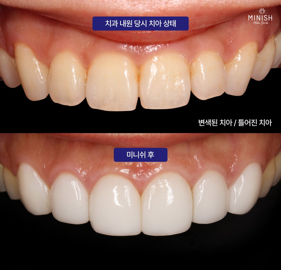 미니쉬를 통해 누런 치아를 밝고 자연스럽게 개선하였고 동시에 틀어진 치아를 바로 잡아 가지런한 치아 배열을 이루었습니다. 미니쉬 치료는 첨단 기기를 사용해 빠르고 정밀한 제작이 가능하며 치과 내에 기공 연구소가 구축되어 연구원과 의료진의 협업이 이루어집니다. 이를 통해 원데이 치료가 가능하며, 환자분의 경우 단 하루 만에 변색된 치아 개선하였기에 치료 결과, 과정 모두 만족해 하셨습니다.