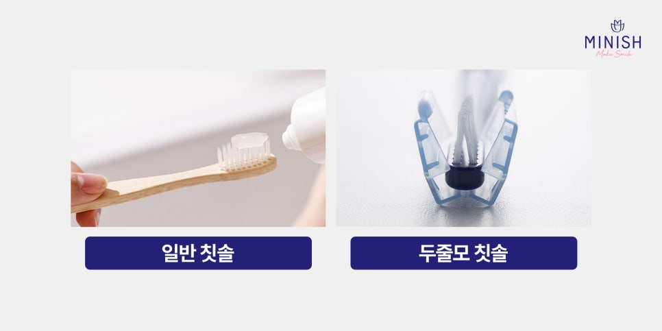 교정 중에는 일반 칫솔과 함께 두줄모 칫솔을 사용하는 것이 좋습니다. 두줄모 칫솔은 장치 사이사이를 더 꼼꼼하게 닦을 수 있어 치아 건강에 도움을 줍니다. 저희 미니쉬치과병원의 굿모닝 칫솔, 굿나잇 칫솔을 사용하여 치아교정 양치질 방법을 알려드리도록 하겠습니다.