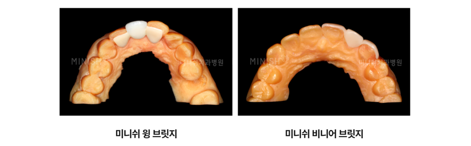 미니쉬 브릿지는 상실된 치아의 양옆 치아 손상량을 최소화하여 상실된 치아를 대체하는 치료입니다. 케이스에 따라 윙브릿지, 비니어브릿지 등 2가지 타입으로 나눠집니다.