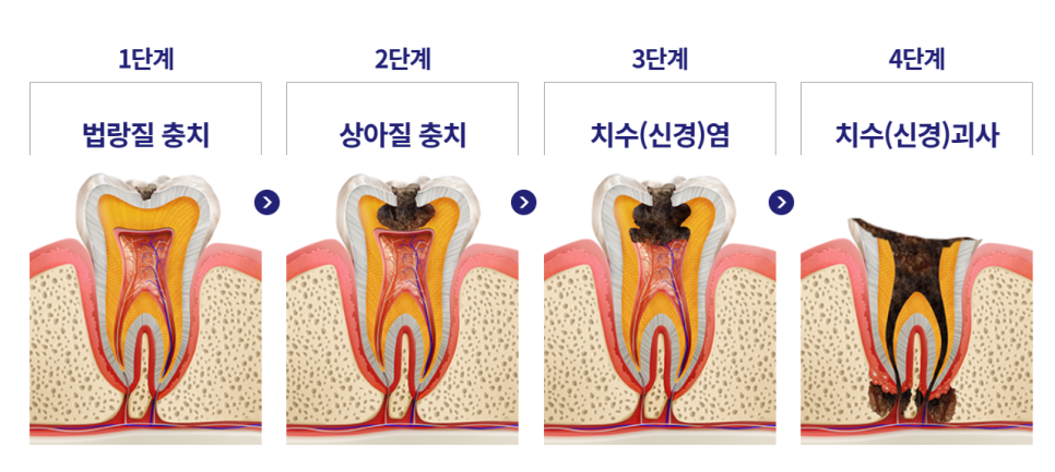 충치 단계별 진행상황(출처=미니쉬 치과병원 홈페이지)