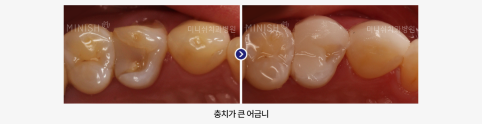 충치가 큰 치아는 치아복구 솔루션인 미니쉬를 활용한 치료로 치아 건강과 심미적 회복을 동시에 이룰 수 있습니다.