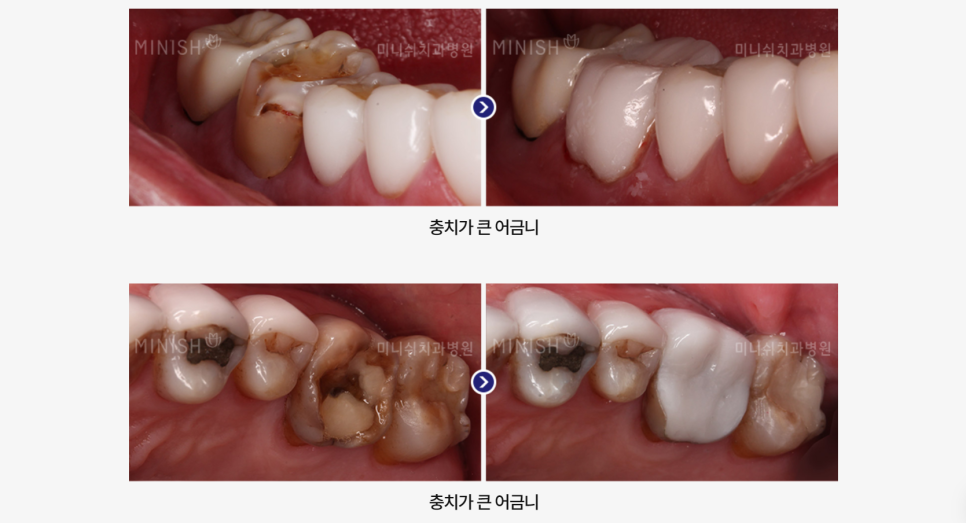 미니쉬는 어금니에도 적용이 가능합니다. 크라운으로 불필요한 치아 손상을 가하지 않고 미니쉬로 손상된 치질만을 제거한 후 치료가 가능합니다. 충치가 큰 치아 외에도 금이 간 치아, 파절된 치아, 신경치료한 치아 등 광범위한 치아손상이 있을 경우 미니쉬가 건강한 대안이 될 수 있습니다.