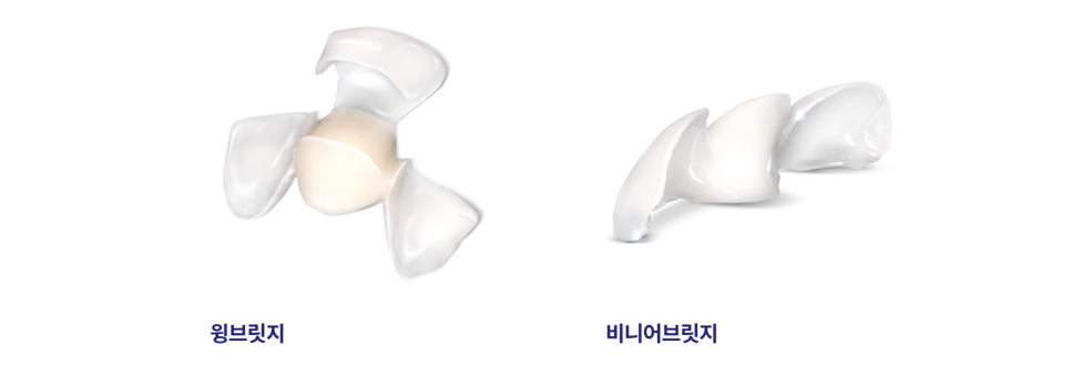 윙브릿지는 상실된 치아 양옆이 건강해 치아삭제가 필요 없는 경우, 비니어 브릿지는 상실된 양옆 치아의 치료가 함께 필요할 경우 적합하다.