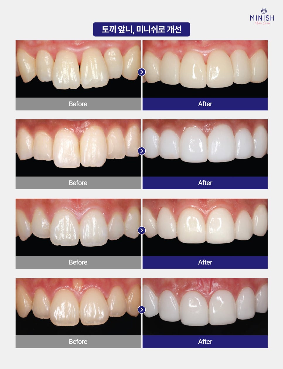 교정의 긴 시간이 부담스럽고, 치아에 해를 가하지 않는 방법을 찾고 있다면 미니쉬가 적합한 해결책입니다. 심미적 문제뿐만 아니라 기능적 문제까지 해결할 수 있는 미니쉬로 자신감 있는 미소를 되찾으세요!