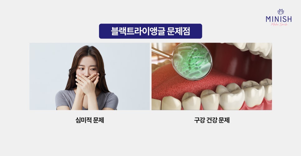 블랙트라이앵글은 음식물과 세균이 쌓이기 쉬운 구조로, 충치나 치주 질환의 위험을 높이며 구취의 원인이 될 수 있습니다.