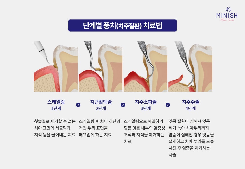 잇몸에 염증이 생긴 초기 단계라면 스케일링만으로도 충분히 치료할 수 있어요. 스케일링은 치아에 쌓인 치석과 세균을 제거해 잇몸의 염증을 줄여주는 치료예요.