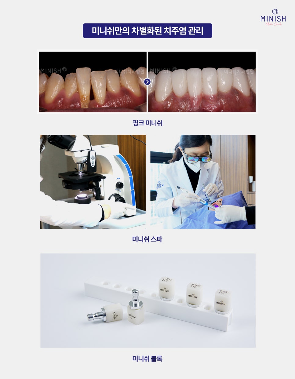 정기적인 미니쉬 스파로 구강 건강을 관리하고, 치주염 치료에는 핑크 미니쉬로 자신 있는 미소를 되찾아보세요!