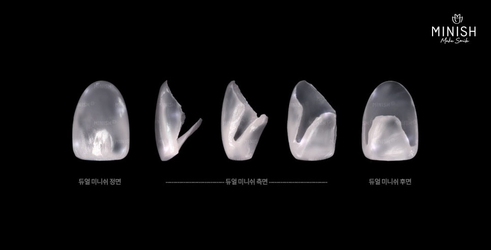 듀얼미니쉬는 치아의 앞뒤를 모두 감싸는 형태로 설계된 미니쉬 치료법입니다. 일반적인 미니쉬보다 치아를 보호하는 면적이 넓어, 파절이 심한 치아를 안정적으로 복구할 수 있습니다.
