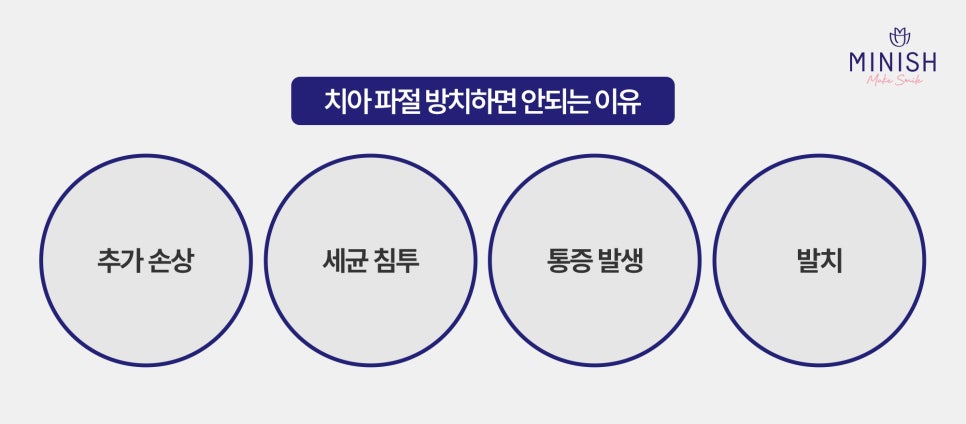 치아 파절은 시간이 지날수록 문제를 악화시킬 수 있습니다. 조기에 치료받아야 치아 건강을 지키고 추가적인 문제를 예방할 수 있습니다. 미니쉬치과병원에서 정확한 진단과 최적의 치료를 받아 건강한 미소를 되찾으세요 :)