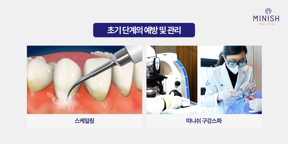 미니쉬 구강스파 : 치면 세균막 관리와 잔여 치석 제거, 잇몸 관리까지 포함한 종합적인 구강 관리 프로그램으로, 스케일링보다 출혈이 적고 염증 완화 효과가 뛰어납니다.