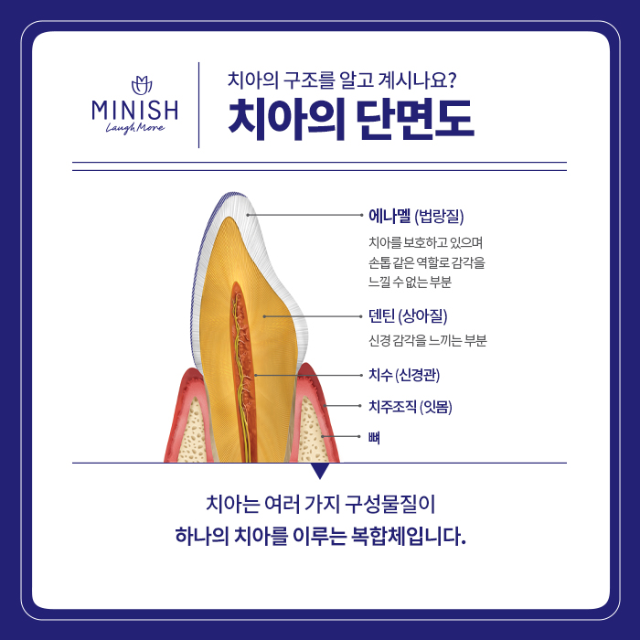 치아의 겉면을 감싸고 있는 법랑질은 뼈처럼 단단하지만, 그 안쪽의 상아질은 마치 고무 지우개처럼 말랑하고 수분이 가득 차 있습니다.