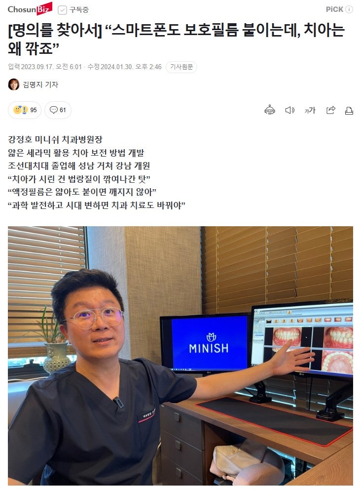 조선비즈 ‘명의를 찾아서’ – 치과 치료의 새로운 혁신, 미니쉬를 개발한 강정호 원장