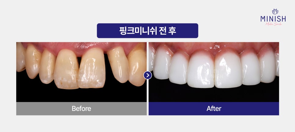 또한, 잇몸이 많이 내려앉아 치아가 길어 보이는 경우, 단순한 치료만으로는 심미적인 회복이 어렵습니다. 이럴 때는 핑크미니쉬를 통해 잇몸 라인을 복구하고 자연스러운 잇몸 형태를 되찾을 수 있습니다.