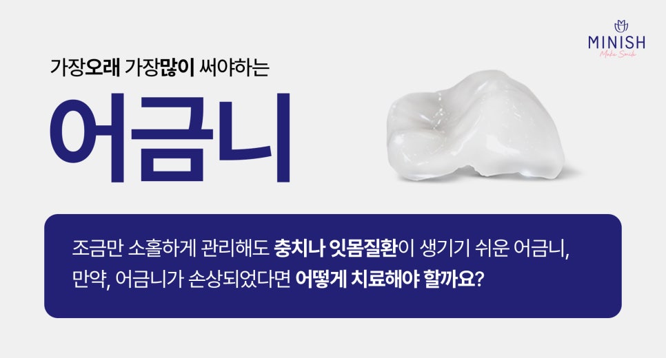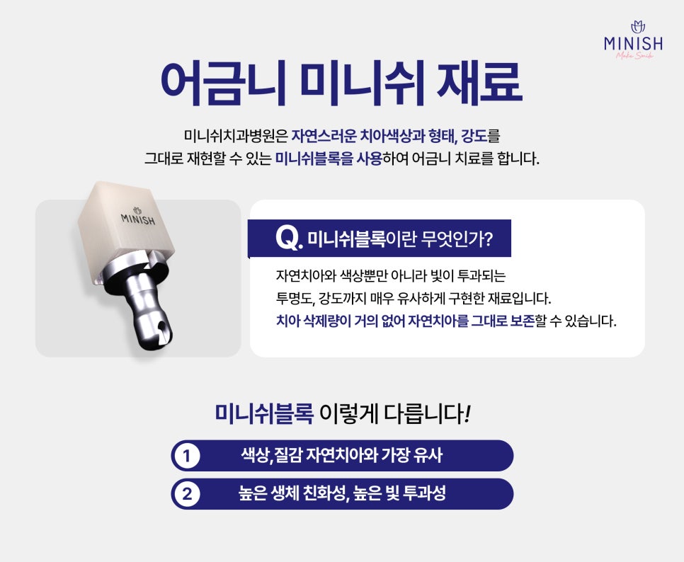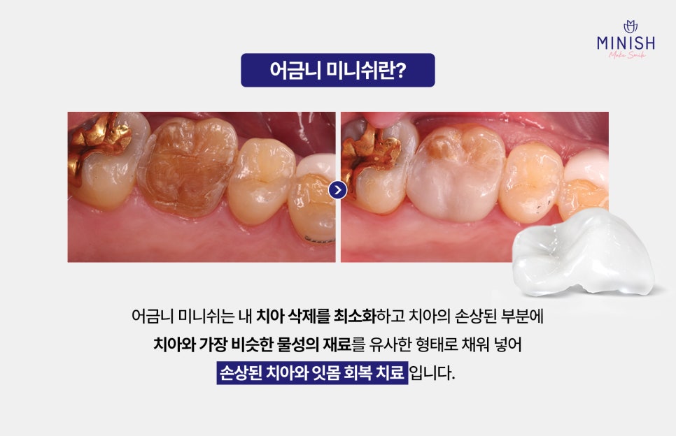 미니쉬는 ‘내 치아를 평생 건강하게 사용하자’는 철학을 바탕으로 개발된 치아 복구 솔루션으로, 자연치아의 구조와 기능을 최대한 복원하는 데 중점을 둡니다.