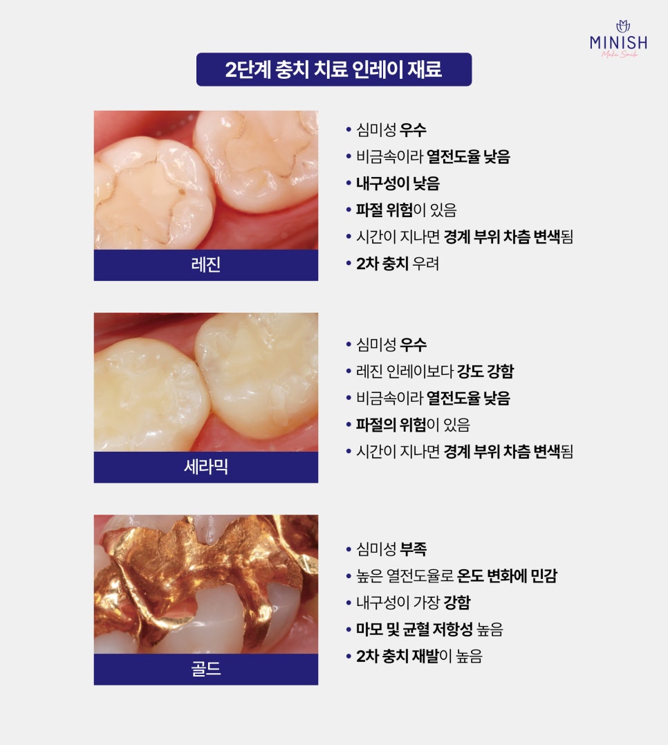단점: 금속 특유의 색상으로 심미성이 떨어집니다. 또한 열전도율이 높아 뜨겁거나 찬 음식에 민감할 수 있습니다. 연성이 있어 마모가 빠르게 진행될 수 있으며 구강 환경에 따라 수축과 팽창이 발생해 2차 충치가 재발할 가능성이 있습니다.