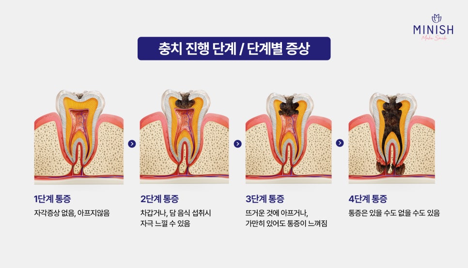충치는 진행 정도에 따라 4단계로 나뉩니다.