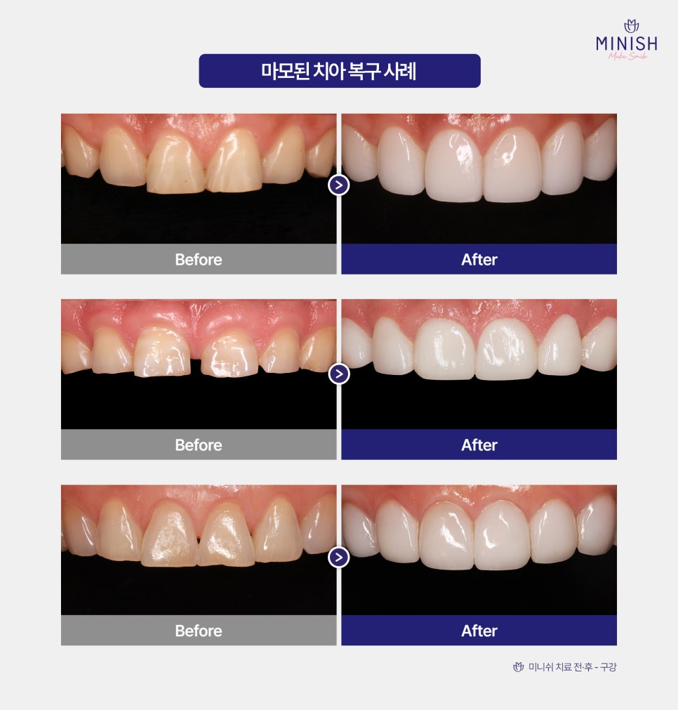 마모된 치아, 치아복구 솔루션 미니쉬 전후