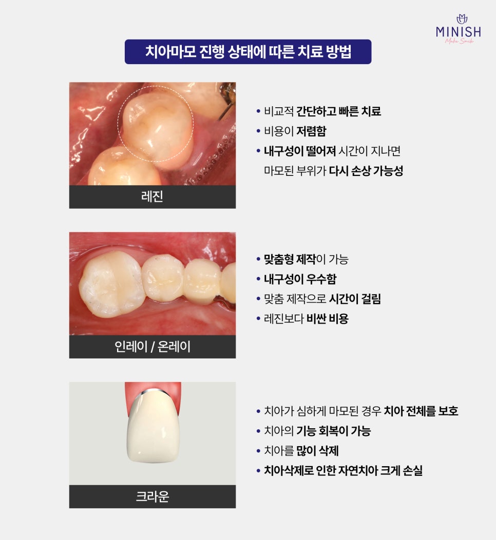 기존의 레진, 인레이/온레이, 크라운 치료법은 치아를 복구하는 데 도움을 주지만 각각의 한계점이 있습니다. 일부 치료법은 치아의 많은 부분을 삭제해야 하거나 시간이 지나면서 내구성이 떨어져 다시 문제가 발생할 수 있습니다. 치아복구 솔루션 미니쉬는 이러한 기존 치료법과는 차별화된 접근 방식을 제공합니다. 미니쉬는 내구성이 뛰어난 재료와 초정밀 가공 기술을 활용하여 불필요한 치아 삭제를 최소화합니다. 이를 통해 치아 본연의 구조와 건강을 최대한 유지하면서 손상된 부위만 정교하게 복구할 수 있습니다.