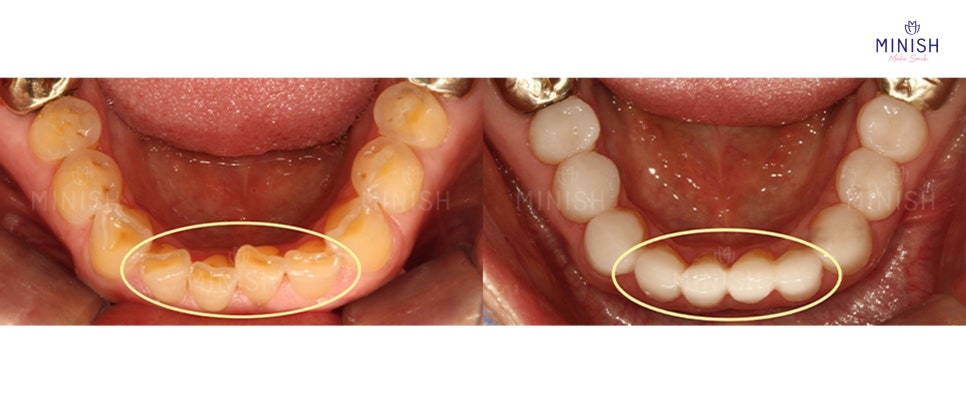 듀얼 미니쉬는 치아 앞면은 물론, 혀 쪽 안쪽 면(설면)까지 정밀하게 복구하여 자연스러운 배열과 보호를 동시에 이끌어낼 수 있습니다. 윗사진에서도 확인할 수 있듯, 각기 다르게 배열되어 있던 아랫니가 고르게 정리되고 닳았던 부분까지 건강하게 복구된 모습을 볼 수 있습니다.