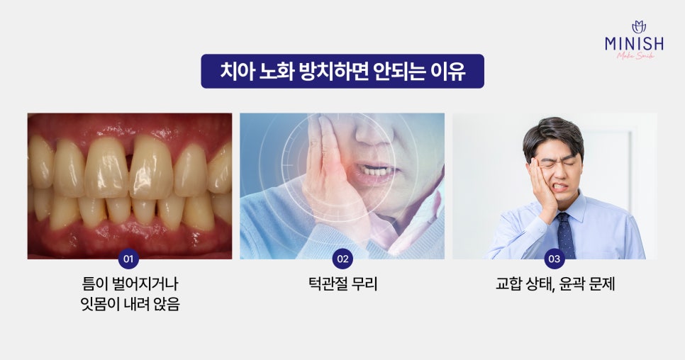 또 마모와 함께 진행되는 노화 현상으로 인해 치아 사이 틈이 벌어지거나 잇몸이 내려앉는 변화도 함께 나타날 수 있기 때문에, 단순한 마모로 보기보다 구강 전체의 구조적 문제로 이해하고 관리하는 것이 필요합니다.