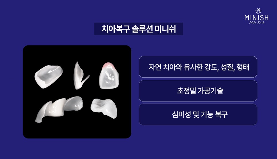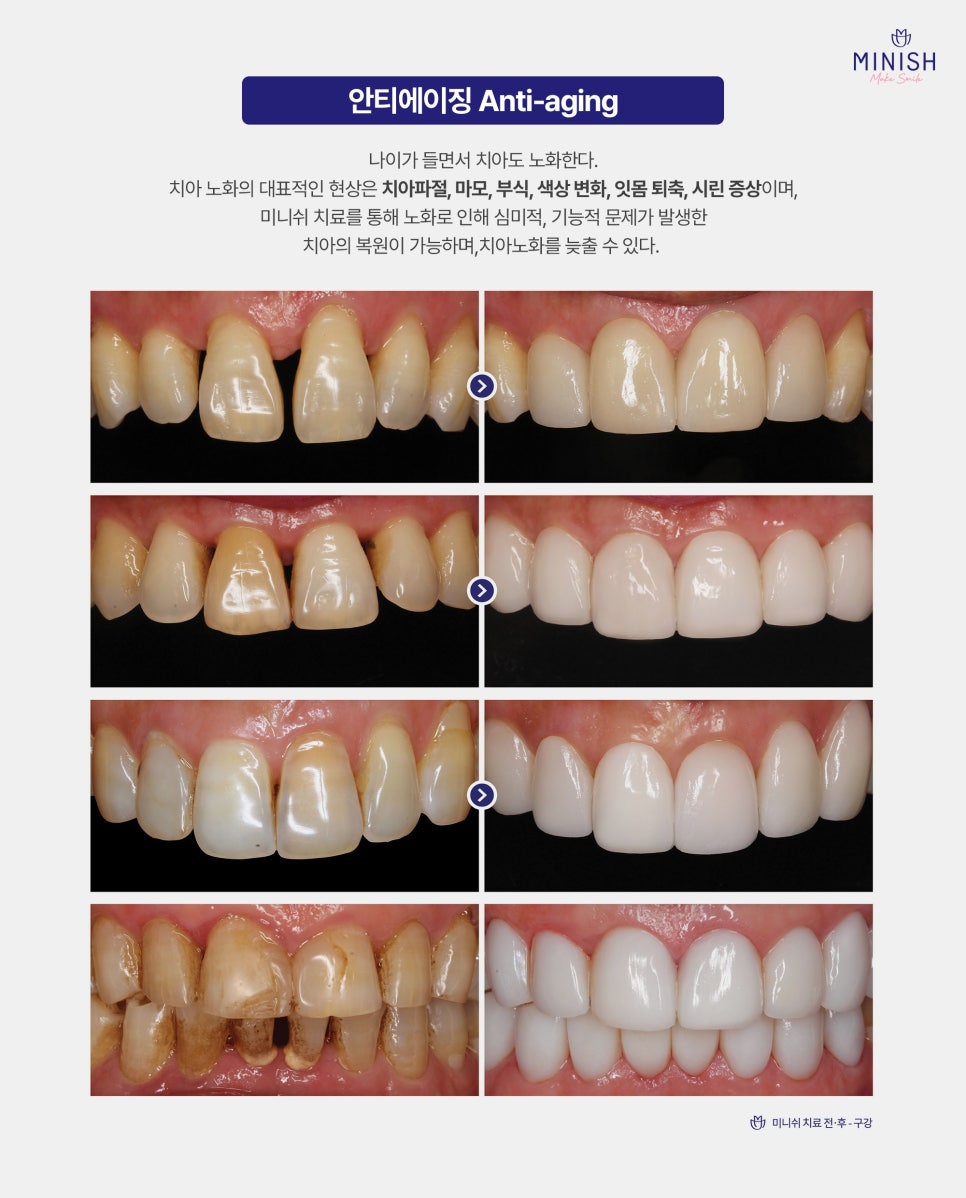 이러한 장점 덕분에 미니쉬는 노화로 인해 약해지고 마모된 치아를 회복하는 데 효과적이며, 치아 안티에이징 솔루션으로 매우 적합하다는 평가를 받고 있습니다.